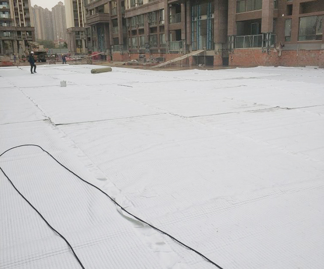 高分子防護排水異型片自粘土工布卷材是由高密度聚乙烯(HDPE)純白原料,在熔融狀態下經真空吸塑一次成型制成,制造出的單向連續密閉殼體型凸起的板狀材料,形成一種膜、殼連接,具有立+體排水空間和一定支撐剛度,液體、氣體可以在其內流動的防護排水卷材。
